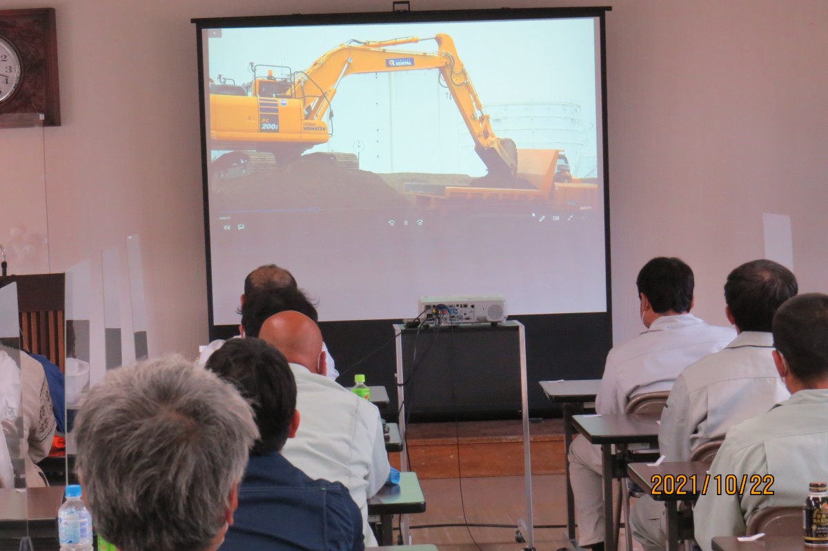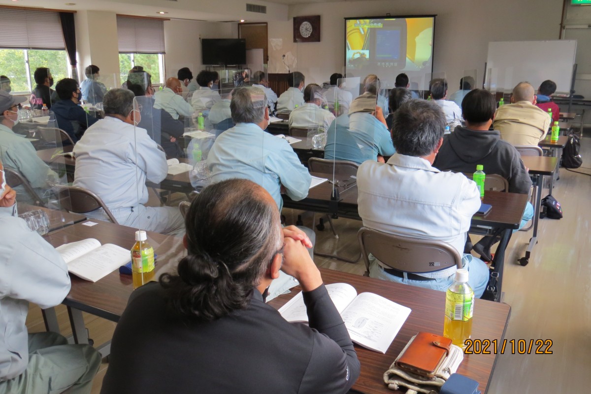 当協会の関連団体(会員同一)であります“建設業労働災害防止協会島根県支部邑智分(上原分会長)”では、過般10月22日に邑智建設会館に於いて、「車両系建設機械(整地・運搬・積込み用及び掘削用)運転業務従事者安全衛生教育」を開催致しました。 当日は、各会員企業より48名が受講、本部の品川次長と㈱ライト中央支店の2名の講師により、8時50分から16時まで、みっちり教育を行い、今後の安全安心な工事施工の一助と致しました。