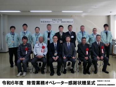 県央県土整備事務所では、平成22年10月1日に制定した「除雪業務に関する表彰規定」により、永年除雪業務に携わって頂いてるオペレーターの方の労に感謝するとともに、他の従事者のさらなる励みになるよう平成22年度より除雪従事者の表彰式を挙行されているところであります。 この間、コロナ禍の影響により中断をしておりましたが、この度11月25日に川本合同庁舎において、令和6年度の表彰式が挙行され、下記の皆様方が受賞の栄に浴され、土屋所長から感謝状及び記念品が、また一般社団法人島根邑智建設業協会の上原会長からも記念品が贈呈されました。